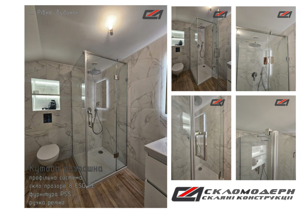 Скляні конструкції “Скло Модерн” виготовляються із безпечного гартованого скла. Товщина скла залежно від конструктивних особливостей, може бути від 8 до 10 мм. В окремих випадках використовується багатошарове скло (триплекс) – являє собою два або більше скла склеєних між собою спеціальною полімерною плівкою. В скляних конструкція душових кабін найчастіше використовується триплекс товщиною скла 4+4 мм та 5+5 мм.